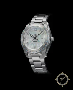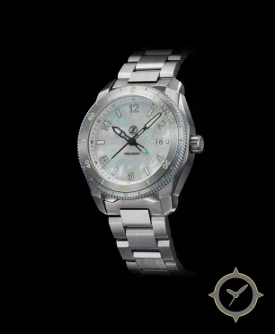 A Dive watch with a versatile 40mm case, that suits most wrists, crafted from stainless steel featuring a white dial with a unique mother-of-pearl (iridescent) finish and a true GMT complication for tracking a second time zone.