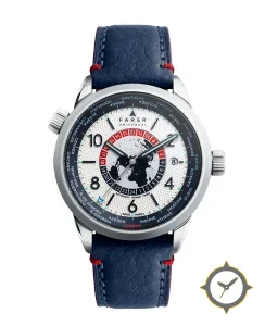 A World Timer watch with a bold 46.5mm presence on the wrist, crafted from stainless steel featuring a white dial with a unique guilloché (textured waffle) finish, perfect for the global traveler with its world-time function.