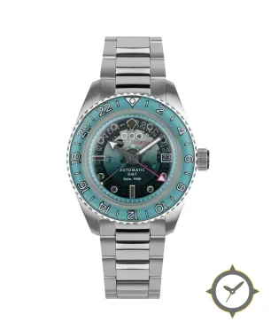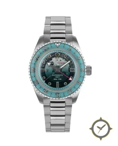 A GMT watch with a vintage-inspired 36mm case, crafted from stainless steel featuring a turquoise dial with a unique gradient finish and a true GMT complication for tracking a second time zone.