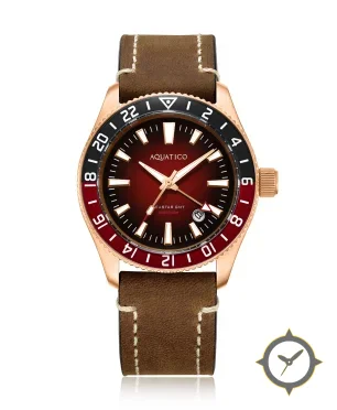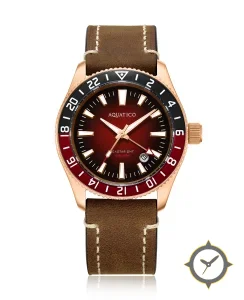 A GMT watch with a bold 46.5mm presence on the wrist, crafted from bronze featuring a red dial with a unique sunburst gradient finish and a true GMT complication for tracking a second time zone.