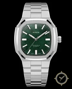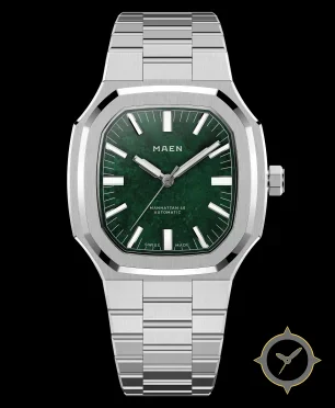 A Luxury watch with a bold 43mm presence on the wrist, crafted from stainless steel featuring a green dial with a unique marbled/stone texture finish.