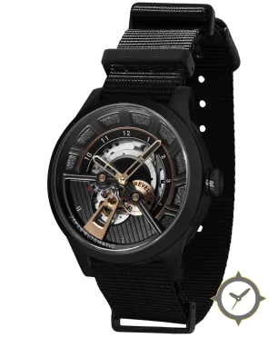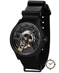 A Skeleton watch with a vintage-inspired 37mm case, crafted from stainless steel featuring a black dial with a unique skeleton open-worked with metallic bridges and a ribbed lower sector finish.