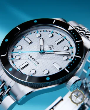 A Dive watch with a bold 44.5mm presence on the wrist, crafted from stainless steel featuring a white dial with a unique waffle / crosshatch texture finish.