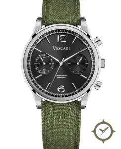 A Chronograph watch with a bold 48mm presence on the wrist, crafted from stainless steel featuring a black dial with a unique sunburst finish.
