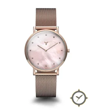 A Dress watch with a versatile 38.5mm case, that suits most wrists, crafted from gold featuring a white dial with a unique mother-of-pearl finish.