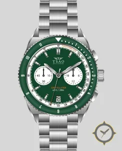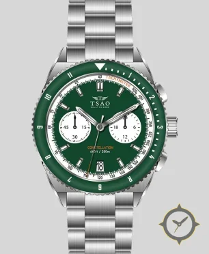 A Chronograph watch with a bold 43mm presence on the wrist, crafted from stainless steel featuring a green dial with a unique matte lacquer finish.