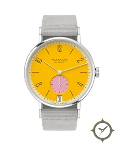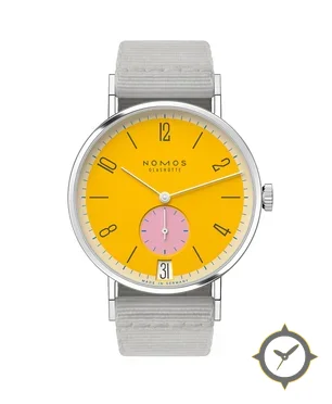A Dress watch with a vintage-inspired 31.5mm case, crafted from stainless steel featuring a yellow dial with a unique smooth lacquer finish.