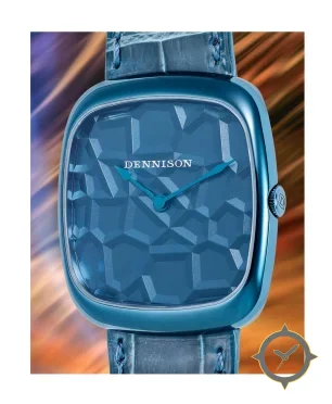 A Dress watch with a vintage-inspired 30mm case, crafted from stainless steel featuring a blue dial with a unique three-dimensional faceted / gem-cut geometric relief finish and a true GMT complication for tracking a second time zone.