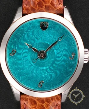 A Dress watch with a vintage-inspired 33.5mm case, crafted from stainless steel featuring a turquoise dial with a unique guilloché (engine-turned) finish.