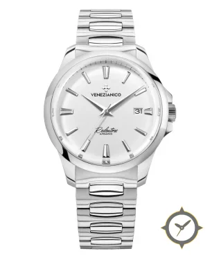 A Dress watch with a bold 44.5mm presence on the wrist, crafted from stainless steel featuring a white dial with a unique lacquer (smooth) finish.