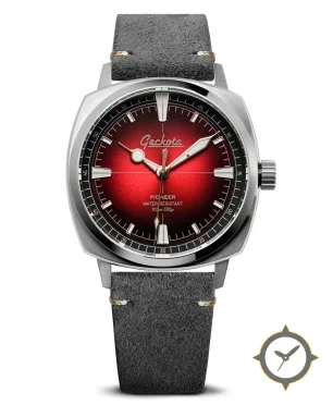 A Vintage watch with a vintage-inspired 34.5mm case, crafted from stainless steel featuring a red dial with a unique sunburst gradient (ombré) finish.