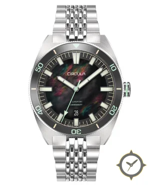 A Dive watch with a bold 45.5mm presence on the wrist, crafted from stainless steel featuring a black dial with a unique mother-of-pearl / iridescent finish.