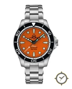 A Dive watch with a bold 46mm presence on the wrist, crafted from stainless steel featuring a orange dial with a unique matte finish.