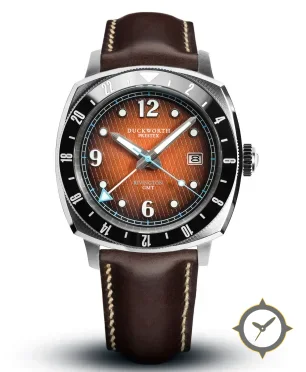 A GMT watch with a bold 43.5mm presence on the wrist, crafted from stainless steel featuring a brown dial with a unique fumé/sunburst with diagonal hatch texture finish and a true GMT complication for tracking a second time zone.