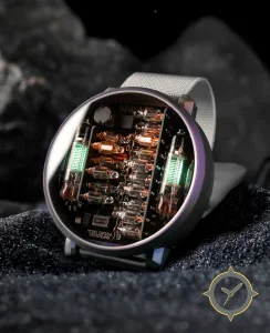 A Vintage watch with a bold 52.5mm presence on the wrist, crafted from stainless steel featuring a black dial with a unique exposed vacuum/Nixie tubes and visible circuitry finish.