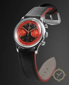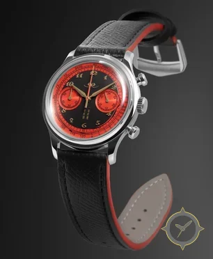 A Chronograph watch with a versatile 40.5mm case, that suits most wrists, crafted from stainless steel featuring a black dial with a unique matte black center with glossy red chapter ring finish.