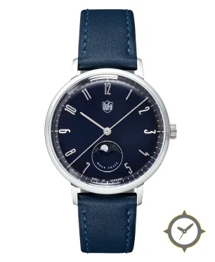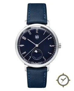 A Dress watch with a vintage-inspired 37.5mm case, crafted from stainless steel featuring a navy dial with a unique sunburst finish finish and a beautiful moonphase display.