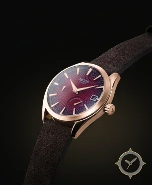 A Dress watch with a vintage-inspired 35.5mm case, crafted from gold featuring a crimson dial with a unique guilloché finish and a helpful power reserve indicator.