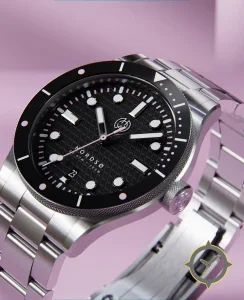 A Dive watch with a bold 44mm presence on the wrist, crafted from stainless steel featuring a black dial with a unique textured geometric / waffle pattern finish.