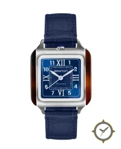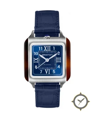 A Dress watch with a vintage-inspired 35.5mm case, crafted from stainless steel featuring a blue dial with a unique guilloché (textured center) finish.