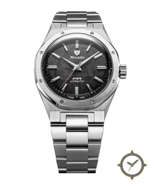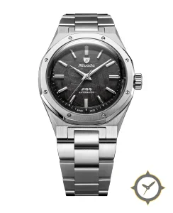 A Luxury watch with a vintage-inspired 37mm case, crafted from stainless steel featuring a black dial with a unique meteorite-style textured finish finish.