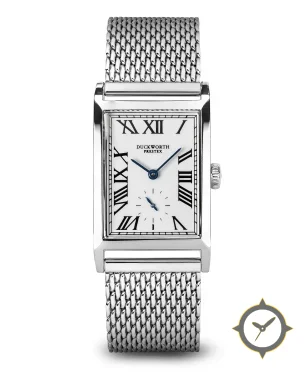 A Dress watch with a vintage-inspired 21.5mm case, crafted from stainless steel featuring a white dial with a unique smooth lacquer finish.