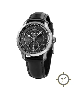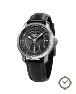 A Dress watch with a vintage-inspired 37.5mm case, crafted from stainless steel featuring a black dial with a unique textured sunburst center with grained outer ring finish.