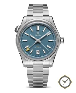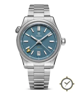 A GMT watch with a vintage-inspired 37mm case, crafted from stainless steel featuring a blue dial with a unique matte grained (sandblasted) finish and a true GMT complication for tracking a second time zone.