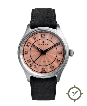 A Dress watch with a vintage-inspired 34mm case, crafted from stainless steel featuring a gold dial with a unique guilloché sunburst (radial) finish.