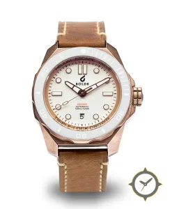 A Dive watch with a bold 51mm presence on the wrist, crafted from bronze featuring a white dial with a unique subtle grained (sand) texture finish.