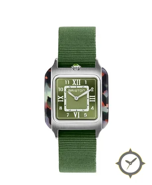 A Dress watch with a vintage-inspired 26mm case, crafted from stainless steel featuring a green dial with a unique textured guilloché central square with smooth outer ring finish.