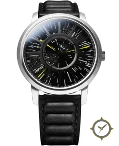 A Minimalist watch with a versatile 39mm case, that suits most wrists, crafted from stainless steel featuring a black dial with a unique radiating burst / textured radial streaks finish.