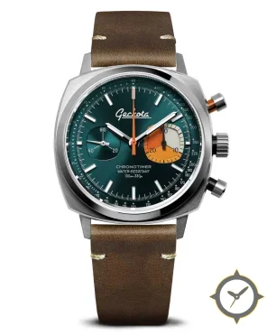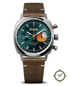 A Chronograph watch with a vintage-inspired 35mm case, crafted from stainless steel featuring a green dial with a unique sunburst finish.