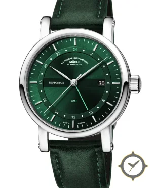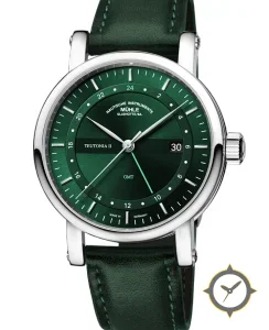 A GMT watch with a bold 47.5mm presence on the wrist, crafted from stainless steel featuring a green dial with a unique sunburst finish and a true GMT complication for tracking a second time zone.