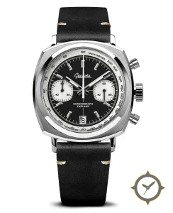 A Chronograph watch with a vintage-inspired 34.5mm case, crafted from stainless steel featuring a black dial with a unique matte finish.