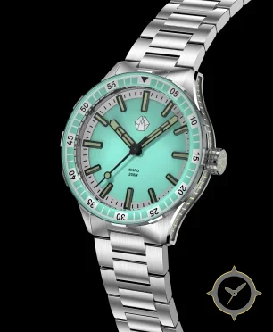 A Sports watch with a vintage-inspired 31.5mm case, crafted from stainless steel featuring a turquoise dial with a unique gradient-sunburst finish.
