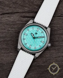 A Sports watch with a bold 44.5mm presence on the wrist, crafted from titanium featuring a turquoise dial with a unique matte with raised geometric tessellated triangle pattern finish.