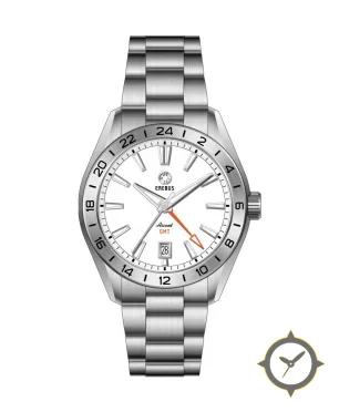 A GMT watch with a versatile 40mm case, that suits most wrists, crafted from stainless steel featuring a white dial with a unique matte finish and a true GMT complication for tracking a second time zone.
