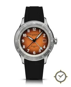 A GMT watch with a vintage-inspired 32.5mm case, crafted from stainless steel featuring a orange dial with a unique fumé / sunburst gradient (vignette from orange center to darker edges) finish and a true GMT complication for tracking a second time zone.