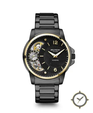A Skeleton watch with a bold 43mm presence on the wrist, crafted from stainless steel featuring a black dial with a unique wavy finish.
