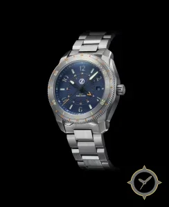 A Dive watch with a bold 49.5mm presence on the wrist, crafted from stainless steel featuring a blue dial with a unique wave guilloché / sunburst texture finish and a true GMT complication for tracking a second time zone.