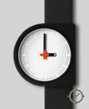 A Minimalist watch with a bold 42.5mm presence on the wrist, crafted from resin featuring a white dial with a unique grooved concentric rings finish.