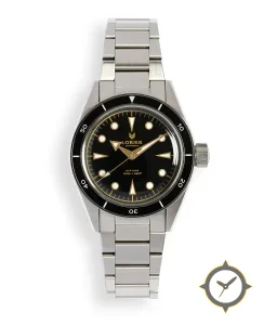 A Dive watch with a vintage-inspired 31.5mm case, crafted from stainless steel featuring a black dial with a unique glossy lacquer finish.