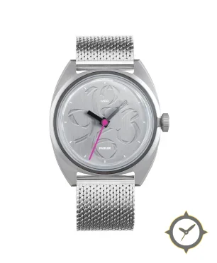 A Minimalist watch with a versatile 40.5mm case, that suits most wrists, crafted from stainless steel featuring a silver dial with a unique brushed metal with subtle embossed abstract pattern finish.
