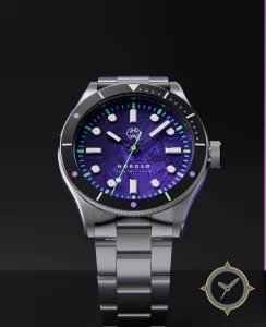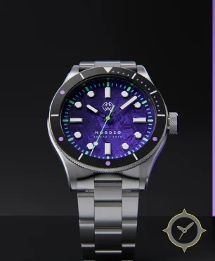 A Dive watch with a versatile 40mm case, that suits most wrists, crafted from stainless steel featuring a purple dial with a unique textured, meteorite-like finish finish.