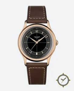 A Dress watch with a vintage-inspired 36.5mm case, crafted from gold featuring a black dial with a unique glossy lacquer finish.