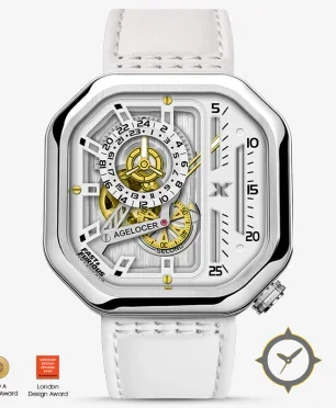 A Skeleton watch with a bold 50.5mm presence on the wrist, crafted from stainless steel featuring a white dial with a unique brushed vertical finish.