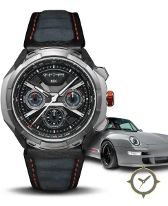 A Chronograph watch with a bold 49.5mm presence on the wrist, crafted from stainless steel featuring a black dial with a unique multi-layered, open-worked with applied bridges and depth finish.