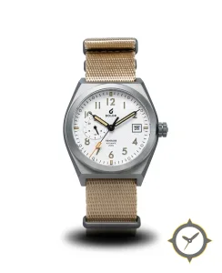 A Field watch with a vintage-inspired 34mm case, crafted from stainless steel featuring a white dial with a unique matte finish.