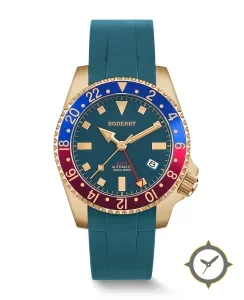 A GMT watch with a bold 45mm presence on the wrist, crafted from gold featuring a turquoise dial with a unique matte finish and a true GMT complication for tracking a second time zone.